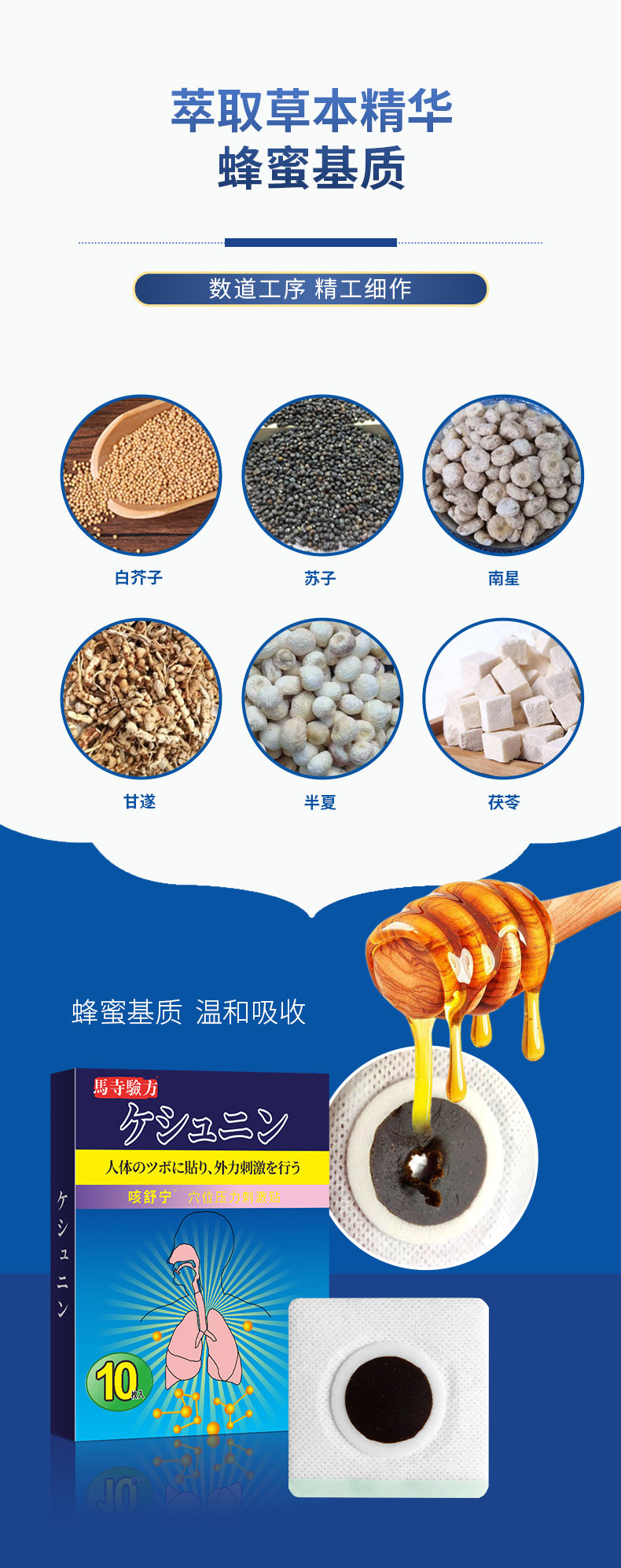馬寺驗方咳舒寧穴位貼,萃取草本,蜂蜜基質溫和吸收,數(shù)道穴位貼加工工序,無紡布背襯穴位敷貼透氣親膚,貼敷方便,小巧便攜,持續(xù)溫護24小時,正規(guī)工廠,標準化生產(chǎn)車間,多樣化定制,出貨快,承接貼牌代加工,支持批發(fā)代理,量大從優(yōu)。